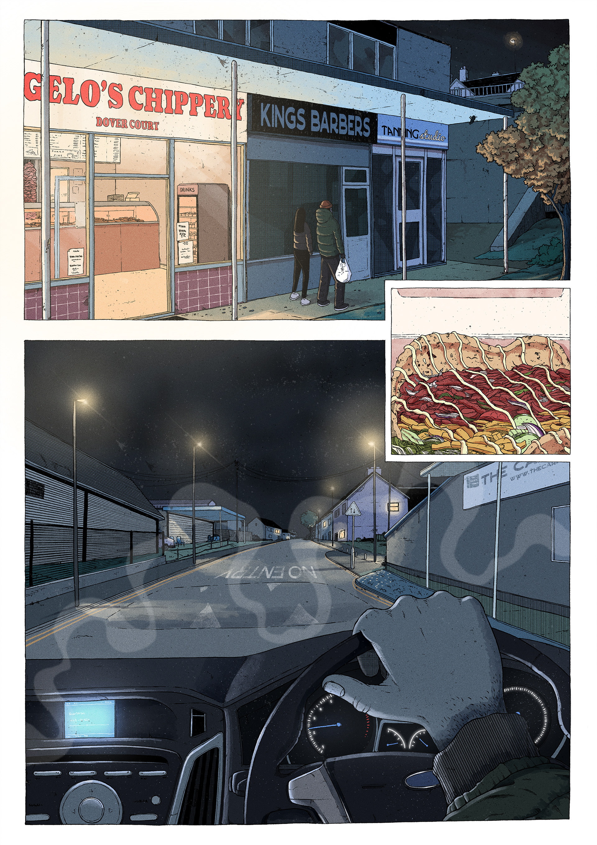 Comic illustration created for the Festival of Illustration's 'Stories of Home' exhibition. This one-page comic is based on me and my sister leaving the local takeaway and driving home, a small routine moment from returning to the town I grew up in. I created the illustration as a commentary on working-class culture through ordinary, recognisable scenes that aren’t typically featured in visual storytelling. I wanted to challenge those conventions and show that something as mundane as visiting the kebab shop can carry meaning. It’s about home, identity, and the separation that develops from moving away from a small working-class town.